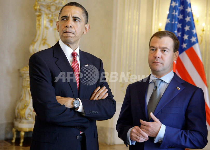 【4月8日 AFP】(一部更新、写真追加)米国のバラク・オバマ(Barack Obama)大統領とロシアのドミトリー・メドベージェフ(Dmitry Medvedev)大統領は8日、チェコの首都プラハ(Prague)で、核兵器の削減などを定めた新核軍縮条約に調印した。