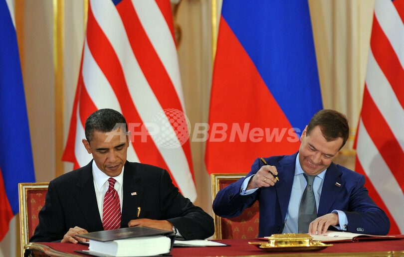 【4月8日 AFP】(一部更新、写真追加)米国のバラク・オバマ(Barack Obama)大統領とロシアのドミトリー・メドベージェフ(Dmitry Medvedev)大統領は8日、チェコの首都プラハ(Prague)で、核兵器の削減などを定めた新核軍縮条約に調印した。