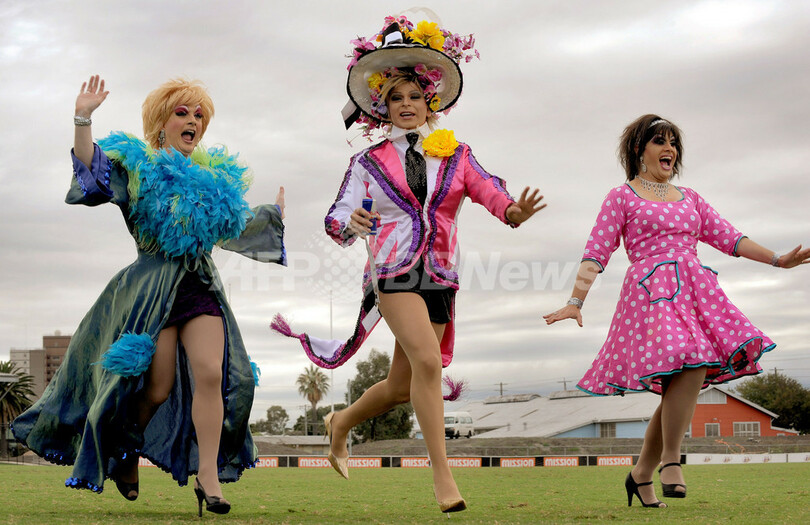 写真は、ギネス記録挑戦前のイベントに参加したドラッグクイーンの「マンリーシスターズ(Manly Sisters)」(2010年4月10日撮影)。(c)AFP/William WEST