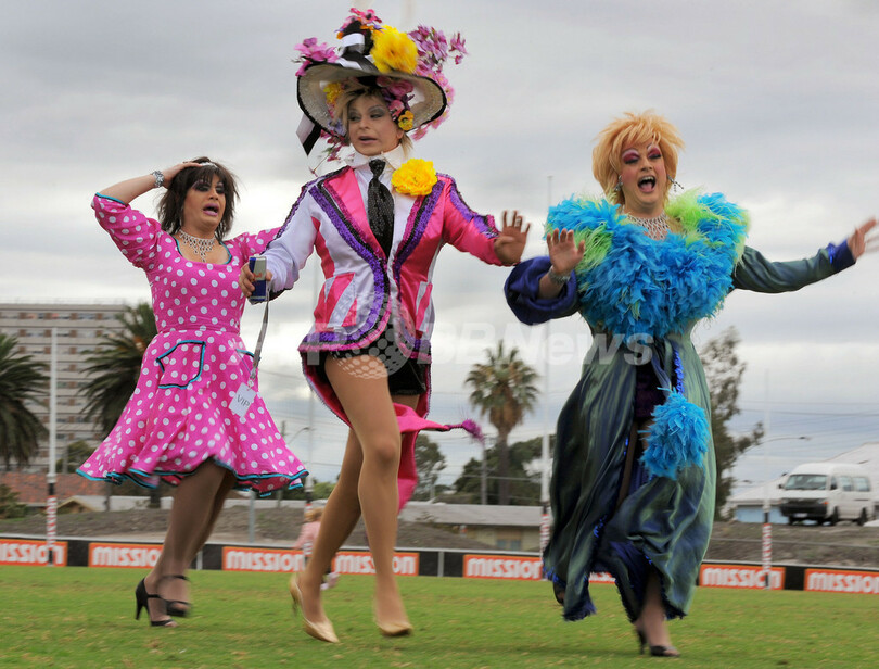 写真は、ギネス記録挑戦前のイベントに参加したドラッグクイーンの「マンリーシスターズ(Manly Sisters)」(2010年4月10日撮影)。(c)AFP/William WEST