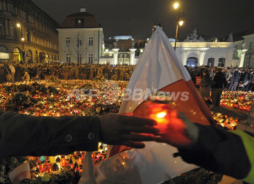 首都ワルシャワ(Warsaw)の大統領府では、数万人の市民が次々と集まり、国歌を歌い、献花した。