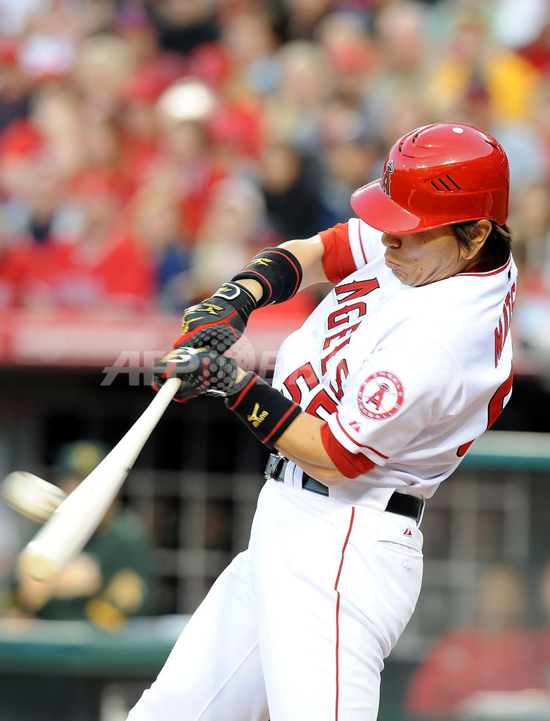 【4月11日 AFP】(12日写真追加)米大リーグ(MLB)のロサンゼルス・エンゼルス・オブ・アナハイム(Los Angeles Angels of Anaheim)の松井秀喜(Hideki Matsui)は10日、本拠地エンゼル・スタジアム・オブ・アナハイム(Angel Stadium of Anaheim)で行われたオークランド・アスレチックス(Oakland Athletics)戦で9回、移籍後初となるサヨナラ安打を放った。