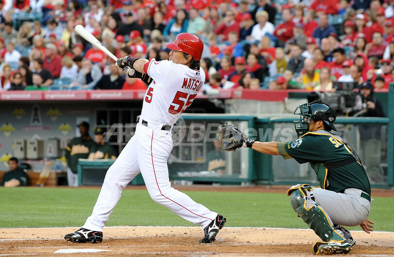 【4月11日 AFP】(12日写真追加)米大リーグ(MLB)のロサンゼルス・エンゼルス・オブ・アナハイム(Los Angeles Angels of Anaheim)の松井秀喜(Hideki Matsui)は10日、本拠地エンゼル・スタジアム・オブ・アナハイム(Angel Stadium of Anaheim)で行われたオークランド・アスレチックス(Oakland Athletics)戦で9回、移籍後初となるサヨナラ安打を放った。