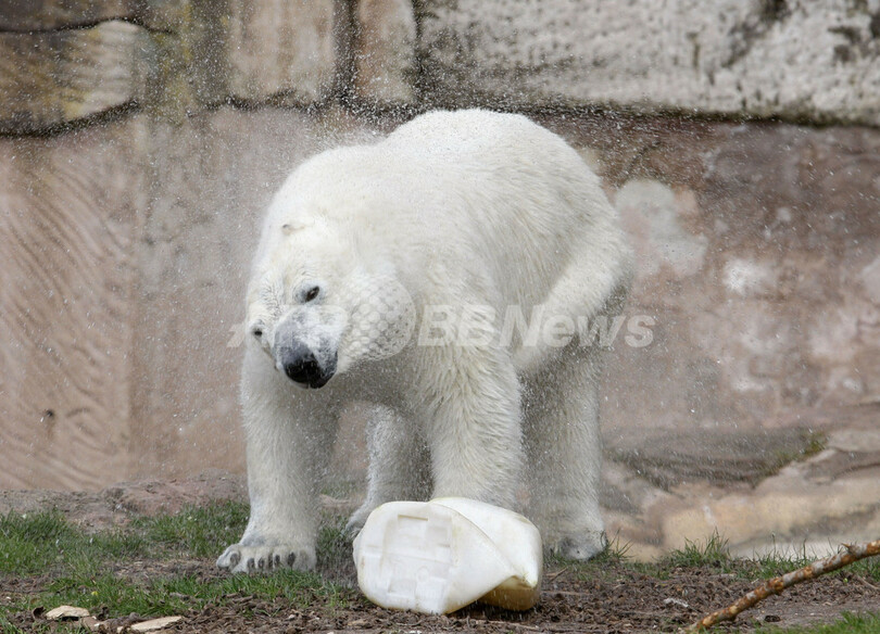 ドイツ南部ニュルンベルク(Nuremberg)の動物園で暮らすホッキョクグマのフロッケ(Flocke)とロシア生まれのラスプーチン(Rasputin)が、4月末までにフランス南東部アンティーブ(Antibes)の動物園に引っ越すことになった。写真は、屋外放飼場のプールから上がったラスプーチン(2010年4月10日撮影)。(c)AFP/DDP/TIMM SCHAMBERGER