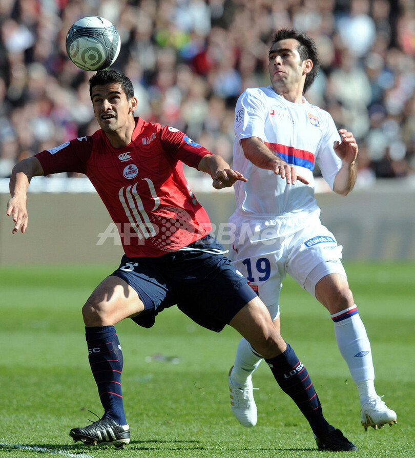 写真はリールのアディル・ラミ(%%Adil Rami%%)とボールを競るリヨンのセサル・デルガド(%%Cesar Delgado%%、右)。(2010年4月11日撮影)(c)AFP/PHILIPPE MERLE