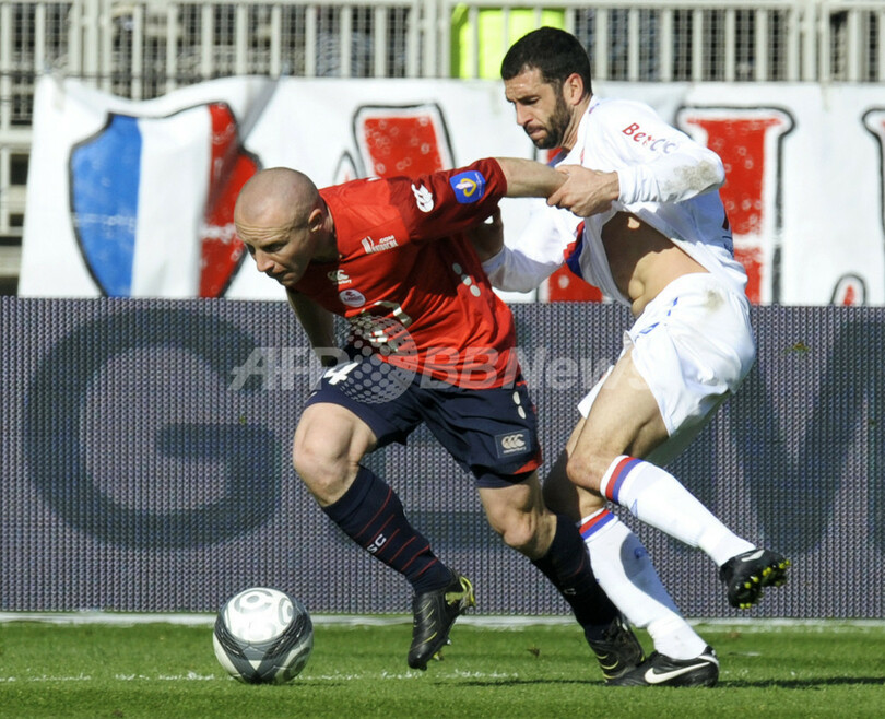 写真はリールのフローレン・バルモン(%%Florent Balmont%%)とボールを競り合うリヨンのリサンドロ・ロペス(%%Lisandro Lopez%%、右)。(2010年4月11日撮影)(c)AFP/PHILIPPE DESMAZES