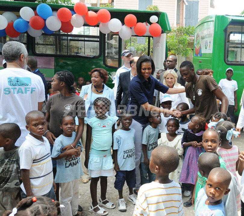その後、ミシェル夫人らは被災した子どもたちが暮らす児童施設を訪問。数十人の子どもらが、英語の歌や踊りで2人を歓迎した。さらにクレオール語の歌も披露した。