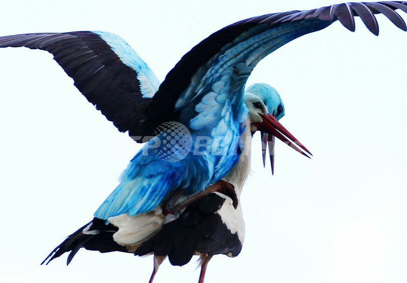 【4月15日 AFP】全身真っ青のコウノトリが見つかり話題となっているドイツ東部の町ビーゲン(Biegen)で、また別の「青いコウノトリ」が姿を見せた。青い色が何に起因するものかは解明されていない。(c)AFP