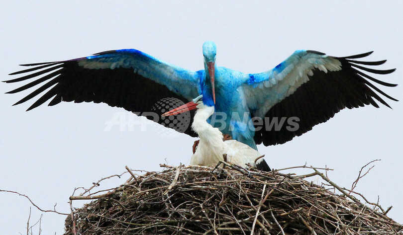 【4月15日 AFP】全身真っ青のコウノトリが見つかり話題となっているドイツ東部の町ビーゲン(Biegen)で、また別の「青いコウノトリ」が姿を見せた。青い色が何に起因するものかは解明されていない。(c)AFP