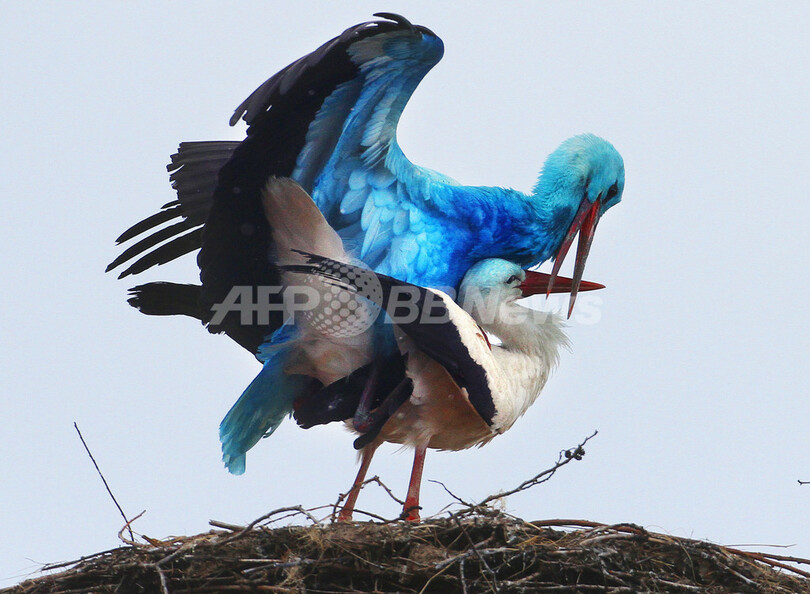 全身真っ青のコウノトリが見つかり話題となっているドイツ東部の町ビーゲン(Biegen)で、また別の「青いコウノトリ」が姿を見せた。青い色が何に起因するものかは解明されていない。写真は、つがいのメスのコウノトリと一緒に過ごす青色のコウノトリ(2010年4月10日撮影)。(c)AFP/DDP/MICHAEL URBAN