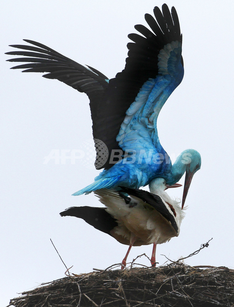 【4月15日 AFP】全身真っ青のコウノトリが見つかり話題となっているドイツ東部の町ビーゲン(Biegen)で、また別の「青いコウノトリ」が姿を見せた。青い色が何に起因するものかは解明されていない。(c)AFP
