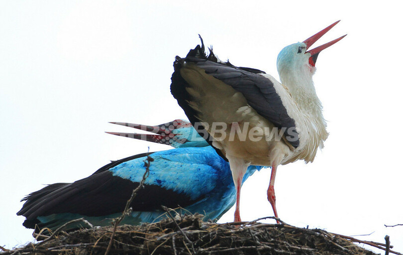 全身真っ青のコウノトリが見つかり話題となっているドイツ東部の町ビーゲン(Biegen)で、また別の「青いコウノトリ」が姿を見せた。青い色が何に起因するものかは解明されていない。写真は、つがいのメスのコウノトリと一緒に過ごす青色のコウノトリ(2010年4月10日撮影)。(c)AFP/DDP/MICHAEL URBAN