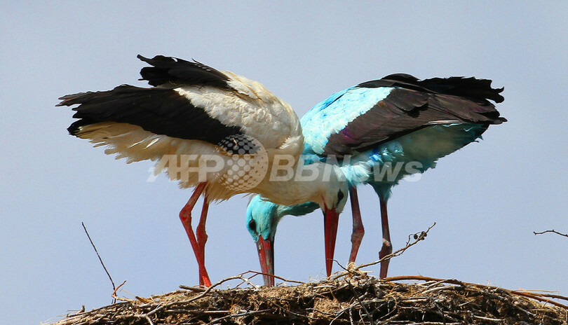 全身真っ青のコウノトリが見つかり話題となっているドイツ東部の町ビーゲン(Biegen)で、また別の「青いコウノトリ」が姿を見せた。青い色が何に起因するものかは解明されていない。写真は、つがいのメスのコウノトリと一緒に過ごす青色のコウノトリ(2010年4月10日撮影)。(c)AFP/DDP/MICHAEL URBAN