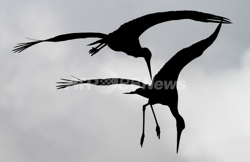 全身真っ青のコウノトリが話題になっているドイツ東部の町ビーゲン(Biegen)で、また別の「青いコウノトリ」が姿を見せた。写真は、空を飛ぶ2羽のコウノトリ(2010年4月10日撮影)。(c)AFP/DDP/MICHAEL URBAN