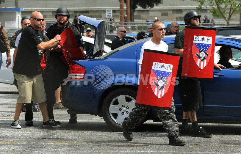 【4月18日 AFP】米ロサンゼルス(Los Angeles)市役所前で17日、ネオナチを名乗る集団のメンバー100人が移民流入に反対するデモを行い、それに対抗するために集まった黒人やゲイコミュニティーのメンバーらと衝突した。
