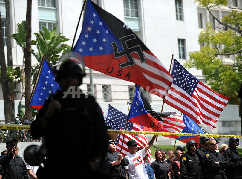 【4月18日 AFP】米ロサンゼルス(Los Angeles)市役所前で17日、ネオナチを名乗る集団のメンバー100人が移民流入に反対するデモを行い、それに対抗するために集まった黒人やゲイコミュニティーのメンバーらと衝突した。