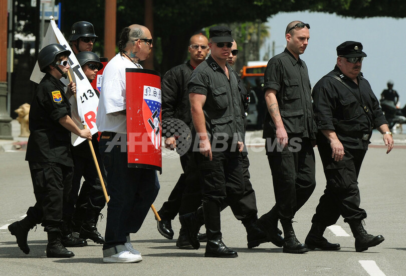 【4月18日 AFP】米ロサンゼルス(Los Angeles)市役所前で17日、ネオナチを名乗る集団のメンバー100人が移民流入に反対するデモを行い、それに対抗するために集まった黒人やゲイコミュニティーのメンバーらと衝突した。