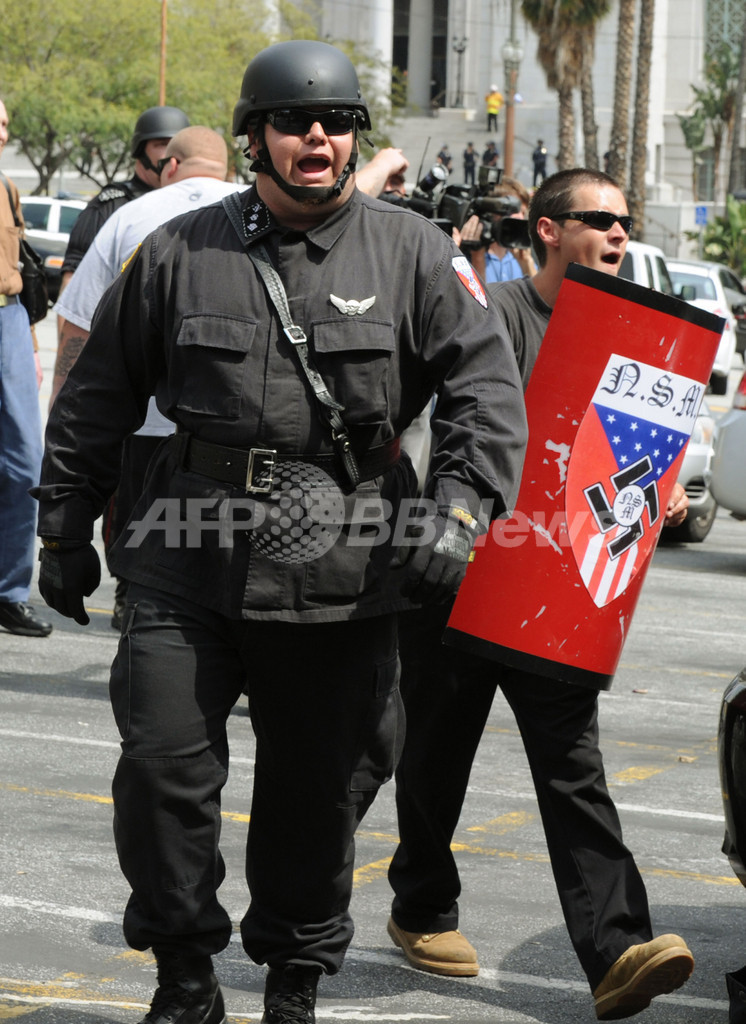 【4月18日 AFP】米ロサンゼルス(Los Angeles)市役所前で17日、ネオナチを名乗る集団のメンバー100人が移民流入に反対するデモを行い、それに対抗するために集まった黒人やゲイコミュニティーのメンバーらと衝突した。