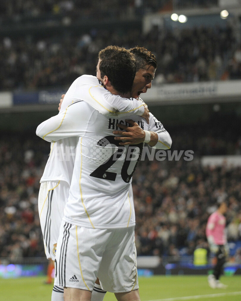 【4月19日 AFP】(写真追加)09-10スペイン1部リーグ第33節、レアル・マドリード(Real Madrid)対バレンシア(Valencia CF)。レアル・マドリードは2-0で勝利し、首位FCバルセロナ(FC Barcelona)との勝ち点差を1に縮めた。