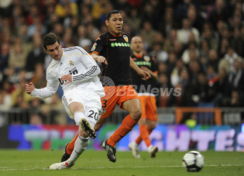 【4月19日 AFP】(写真追加)09-10スペイン1部リーグ第33節、レアル・マドリード(Real Madrid)対バレンシア(Valencia CF)。レアル・マドリードは2-0で勝利し、首位FCバルセロナ(FC Barcelona)との勝ち点差を1に縮めた。