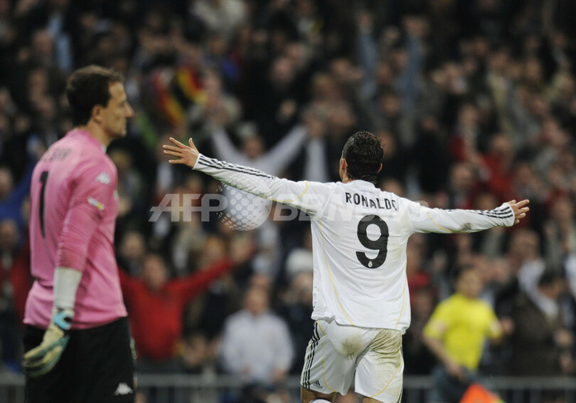 【4月19日 AFP】(写真追加)09-10スペイン1部リーグ第33節、レアル・マドリード(Real Madrid)対バレンシア(Valencia CF)。レアル・マドリードは2-0で勝利し、首位FCバルセロナ(FC Barcelona)との勝ち点差を1に縮めた。