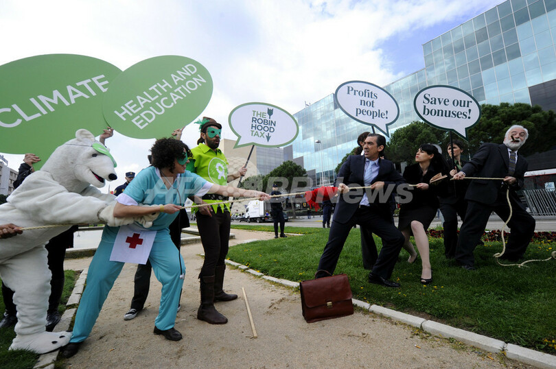 【4月19日 AFP】ユーロ圏財務相会合(ユーログループ、Eurogroup)が開催中のスペイン・マドリード(Madrid)の議会前で16日、国際NGOオックスファム(Oxfam)のオックスファム・スペイン(Intermon Oxfam)メンバーらが「ロビン・フッド(Robin Hood)対銀行家」と題して、ロビン・フッドや銀行家、医師、ホッキョクグマなどに扮(ふん)して綱引きを行う抗議行動をした。