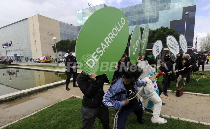 【4月19日 AFP】ユーロ圏財務相会合(ユーログループ、Eurogroup)が開催中のスペイン・マドリード(Madrid)の議会前で16日、国際NGOオックスファム(Oxfam)のオックスファム・スペイン(Intermon Oxfam)メンバーらが「ロビン・フッド(Robin Hood)対銀行家」と題して、ロビン・フッドや銀行家、医師、ホッキョクグマなどに扮(ふん)して綱引きを行う抗議行動をした。
