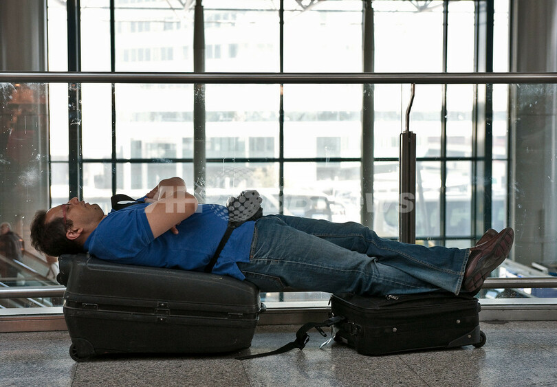 写真は、火山灰の影響で閉鎖されたイタリア・ローマ(Rome)のフィウミチーノ(Fiumicino)国際空港内で仮眠する旅行客(2010年4月19日撮影)。(c)AFP/ANDREAS SOLARO