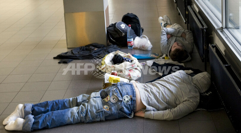 写真は、アムステルダム(Amsterdam)のスキポール(Schiphol)空港で、航空便が欠航したため出発ロビーの床で眠る旅行客ら(2010年4月19日撮影)。(c)AFP/ANP/MARCEL ANTONISSE