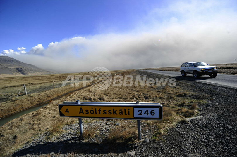 写真は、アイスランドのHvolsvollurで、エイヤフィヤトラヨークトル火山の噴煙が立ち込める道路を通行する車両(2010年4月19日撮影)。(c)AFP/Emmanuel Dunand