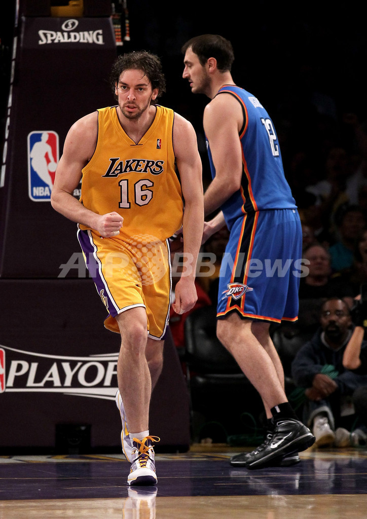 【4月21日 AFP】09-10NBA西カンファレンスプレーオフ1回戦、ロサンゼルス・レイカーズ(Los Angeles Lakers)対オクラホマシティ・サンダー(Oklahoma City Thunder)第2戦。レイカーズはコービー・ブライアント(Kobe Bryant)が39得点を記録し、95-92で競り勝ち2連勝を飾った。