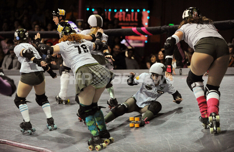 ローラーダービーは米国発祥のコンタクトスポーツ。2チームが傾斜のついた楕円(だえん)のトラックを周回し、ジャマーと呼ばれる選手が対戦チームの選手を1周ずつ追い抜くと得点になる。1922年に始まったローラーダービーは、選手のほとんどが女性で、個性的な衣装やユーモラスなステージネームで知られている。写真は、タフ・クッキーズ(青色のユニホーム)対バーシティ・ブローラーズ(紫色のユニホーム)の試合(2010年4月17日撮影)。(c)AFP/Mark RALSTON