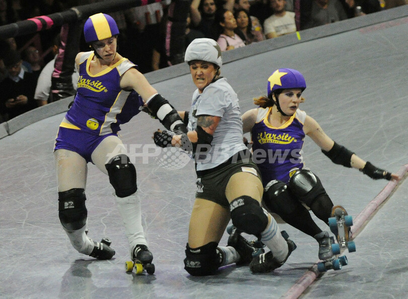 ローラーダービーは米国発祥のコンタクトスポーツ。2チームが傾斜のついた楕円(だえん)のトラックを周回し、ジャマーと呼ばれる選手が対戦チームの選手を1周ずつ追い抜くと得点になる。1922年に始まったローラーダービーは、選手のほとんどが女性で、個性的な衣装やユーモラスなステージネームで知られている。写真は、タフ・クッキーズ(青色のユニホーム)対バーシティ・ブローラーズ(紫色のユニホーム)の試合(2010年4月17日撮影)。(c)AFP/Mark RALSTON