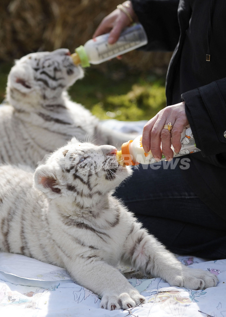 ニュース ライフ ホワイトタイガーの赤ちゃんたち、ドイツ 2010年4月22日 19:09 発信地:ホーデンハーゲン/ドイツ [ ヨーロッパ ドイツ ] このニュースをシェア ‹ › ❮ 5/10 ❯ ドイツ北部ホーデンハーゲン(Hodenhagen)のサファリパーク「セレンゲティ公園(Serengeti Park)」で前月8日に生まれたばかりの生後6週間のホワイトタイガーの赤ちゃん2頭、リコ(Rico)ちゃんとキコ(Kico)ちゃん。2頭の両親、ビアンカ(Bianca)とポール(Paul)が育児を放棄したため、飼育係が育てている。写真は、飼育係にほ乳瓶でお乳をもらうリコちゃんとキコちゃん(2010年4月21日撮影)。(c)AFP/DDP/NIGEL TREBLIN 画像作成中 ! 【4月22日 AFP】ドイツ北部ホーデンハーゲン(Hodenhagen)のサファリパーク「セレンゲティ公園(Serengeti Park)」で前月8日に生まれたばかりの生後6週間のホワイトタイガーの赤ちゃん2頭、リコ(Rico)ちゃんとキコ(Kico)ちゃん。(c)AFP ライフ 一覧へ> メディア・報道関係・法人の方向け 写真・動画 購入のお問合せ>