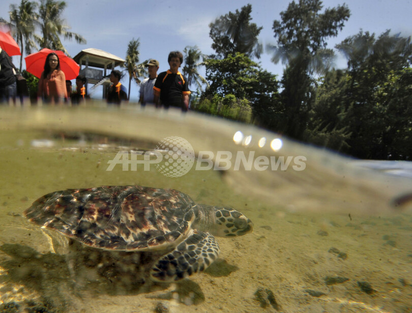 【4月23日 AFP】インドネシア・ジャカルタ(Jakarta)北のプラムカ(Pramuka)島にある国立海洋公園の保護活動家が20日、国際自然保護連合(International Union for the Conservation of Nature and Natural Resources、IUCN)により絶滅危惧種に指定されているウミガメの一種、タイマイ(学名:Eretmochelys Imbricata)を海に放した。タイマイは肉、甲羅、卵を取るための乱獲や、混獲によって種の存続が危ぶまれている。同国では、タイマイ製品の不法取引防止や繁殖地保護などの保護活動が行われている。(c)AFP