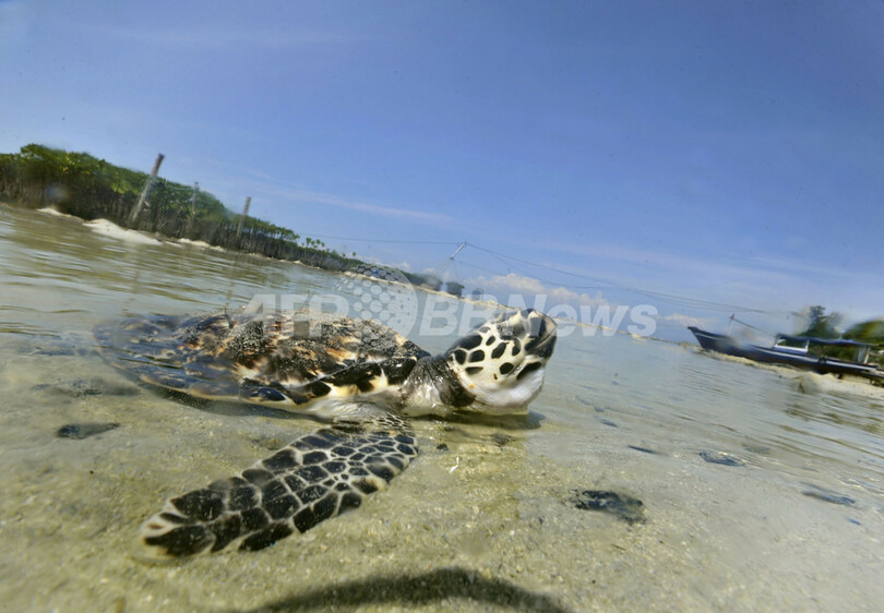 【4月23日 AFP】インドネシア・ジャカルタ(Jakarta)北のプラムカ(Pramuka)島にある国立海洋公園の保護活動家が20日、国際自然保護連合(International Union for the Conservation of Nature and Natural Resources、IUCN)により絶滅危惧種に指定されているウミガメの一種、タイマイ(学名:Eretmochelys Imbricata)を海に放した。タイマイは肉、甲羅、卵を取るための乱獲や、混獲によって種の存続が危ぶまれている。同国では、タイマイ製品の不法取引防止や繁殖地保護などの保護活動が行われている。(c)AFP