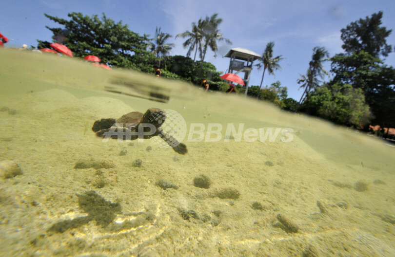 【4月23日 AFP】インドネシア・ジャカルタ(Jakarta)北のプラムカ(Pramuka)島にある国立海洋公園の保護活動家が20日、国際自然保護連合(International Union for the Conservation of Nature and Natural Resources、IUCN)により絶滅危惧種に指定されているウミガメの一種、タイマイ(学名:Eretmochelys Imbricata)を海に放した。タイマイは肉、甲羅、卵を取るための乱獲や、混獲によって種の存続が危ぶまれている。同国では、タイマイ製品の不法取引防止や繁殖地保護などの保護活動が行われている。(c)AFP
