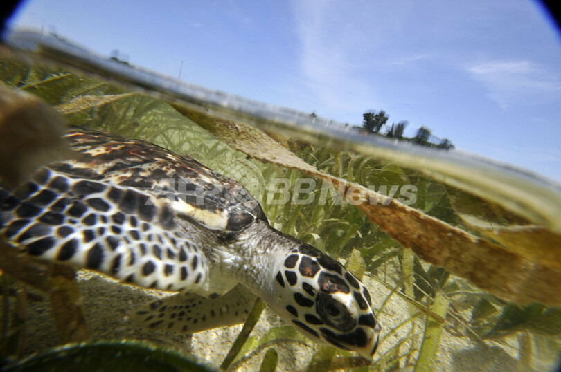 【4月23日 AFP】インドネシア・ジャカルタ(Jakarta)北のプラムカ(Pramuka)島にある国立海洋公園の保護活動家が20日、国際自然保護連合(International Union for the Conservation of Nature and Natural Resources、IUCN)により絶滅危惧種に指定されているウミガメの一種、タイマイ(学名:Eretmochelys Imbricata)を海に放した。タイマイは肉、甲羅、卵を取るための乱獲や、混獲によって種の存続が危ぶまれている。同国では、タイマイ製品の不法取引防止や繁殖地保護などの保護活動が行われている。(c)AFP