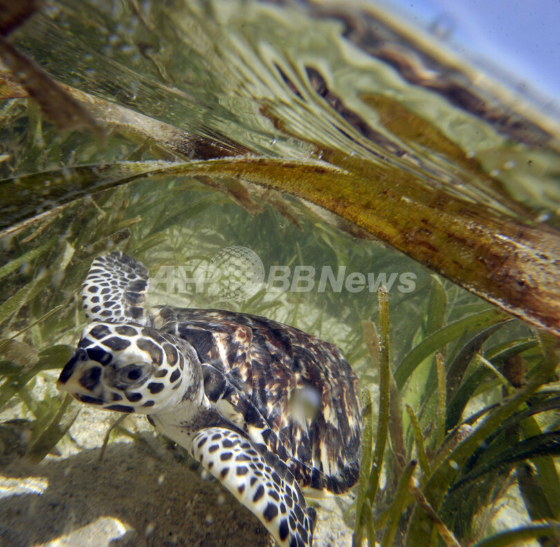 【4月23日 AFP】インドネシア・ジャカルタ(Jakarta)北のプラムカ(Pramuka)島にある国立海洋公園の保護活動家が20日、国際自然保護連合(International Union for the Conservation of Nature and Natural Resources、IUCN)により絶滅危惧種に指定されているウミガメの一種、タイマイ(学名:Eretmochelys Imbricata)を海に放した。タイマイは肉、甲羅、卵を取るための乱獲や、混獲によって種の存続が危ぶまれている。同国では、タイマイ製品の不法取引防止や繁殖地保護などの保護活動が行われている。(c)AFP