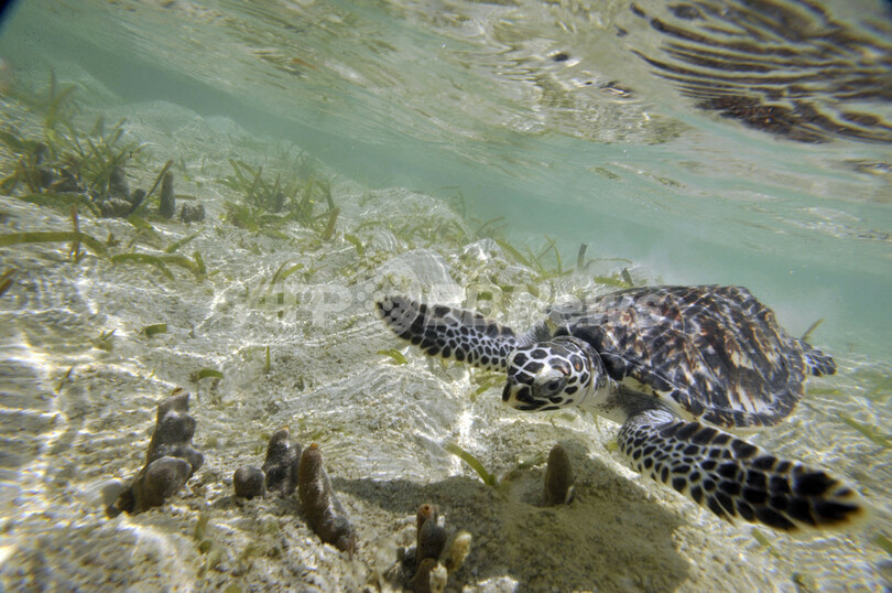 【4月23日 AFP】インドネシア・ジャカルタ(Jakarta)北のプラムカ(Pramuka)島にある国立海洋公園の保護活動家が20日、国際自然保護連合(International Union for the Conservation of Nature and Natural Resources、IUCN)により絶滅危惧種に指定されているウミガメの一種、タイマイ(学名:Eretmochelys Imbricata)を海に放した。タイマイは肉、甲羅、卵を取るための乱獲や、混獲によって種の存続が危ぶまれている。同国では、タイマイ製品の不法取引防止や繁殖地保護などの保護活動が行われている。(c)AFP