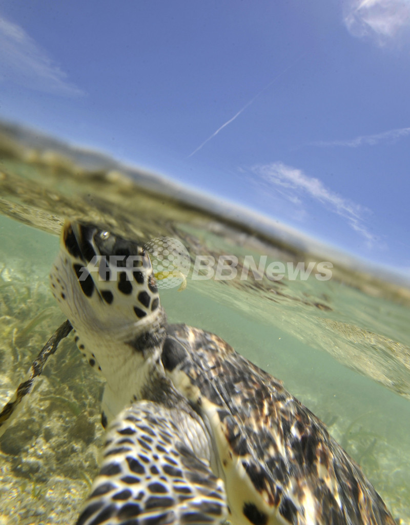 【4月23日 AFP】インドネシア・ジャカルタ(Jakarta)北のプラムカ(Pramuka)島にある国立海洋公園の保護活動家が20日、国際自然保護連合(International Union for the Conservation of Nature and Natural Resources、IUCN)により絶滅危惧種に指定されているウミガメの一種、タイマイ(学名:Eretmochelys Imbricata)を海に放した。タイマイは肉、甲羅、卵を取るための乱獲や、混獲によって種の存続が危ぶまれている。同国では、タイマイ製品の不法取引防止や繁殖地保護などの保護活動が行われている。(c)AFP