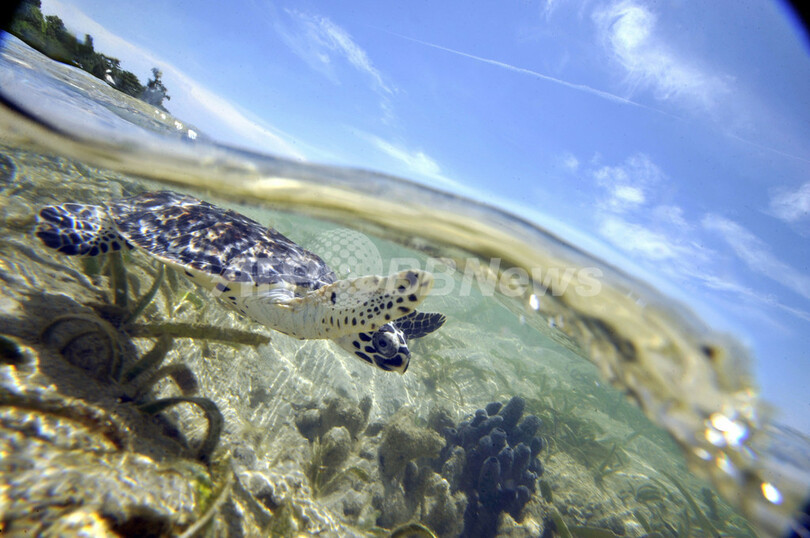 【4月23日 AFP】インドネシア・ジャカルタ(Jakarta)北のプラムカ(Pramuka)島にある国立海洋公園の保護活動家が20日、国際自然保護連合(International Union for the Conservation of Nature and Natural Resources、IUCN)により絶滅危惧種に指定されているウミガメの一種、タイマイ(学名:Eretmochelys Imbricata)を海に放した。タイマイは肉、甲羅、卵を取るための乱獲や、混獲によって種の存続が危ぶまれている。同国では、タイマイ製品の不法取引防止や繁殖地保護などの保護活動が行われている。(c)AFP