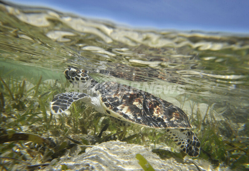 【4月23日 AFP】インドネシア・ジャカルタ(Jakarta)北のプラムカ(Pramuka)島にある国立海洋公園の保護活動家が20日、国際自然保護連合(International Union for the Conservation of Nature and Natural Resources、IUCN)により絶滅危惧種に指定されているウミガメの一種、タイマイ(学名:Eretmochelys Imbricata)を海に放した。タイマイは肉、甲羅、卵を取るための乱獲や、混獲によって種の存続が危ぶまれている。同国では、タイマイ製品の不法取引防止や繁殖地保護などの保護活動が行われている。(c)AFP
