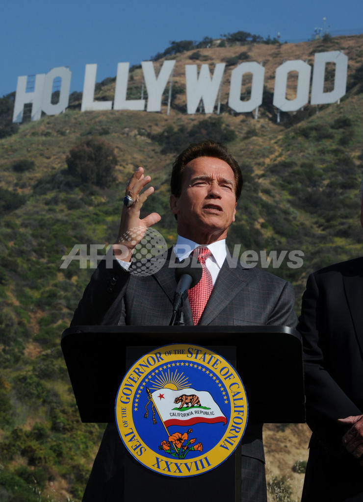 会見にはカリフォルニア(California)州のアーノルド・シュワルツェネッガー(Arnold Schwarzenegger)知事も出席。アクション俳優として活躍していた同知事は、スターになる夢を抱いていた無名のボディービルダー時代にハリウッドサインに刺激を受けたと語った。