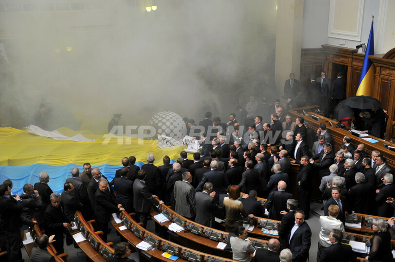ニュース 政治・経済 ウクライナ議会、露海軍の駐留期限延長で大パニックに 2010年4月27日 19:13 発信地:キエフ/ウクライナ [ ロシア・CIS ウクライナ ] このニュースをシェア ‹ › ❮ 17/35 ❯ ウクライナ最高会議(議会)は27日、ロシア黒海艦隊の駐留期限を2042年まで延長する協定を批准した。議会では延長に反対する野党勢力が卵を投げ、発煙筒を使うなどして、議場内が大パニックとなった(2010年4月27日撮影)。(c)AFP/SERGEI SUPINSKY【参考】映像はYoutubeのAFPBBチャンネルでご覧いただけます 画像作成中 ! 【4月27日 AFP】(写真追加)ウクライナ最高会議(議会)は27日、ロシア黒海艦隊の駐留期限を2042年まで延長する協定を批准した。議会では反対派が卵を投げ、発煙筒を使うなどして、議場内が大パニックとなった。(c)AFP 政治・経済 一覧へ> メディア・報道関係・法人の方向け 写真・動画 購入のお問合せ>