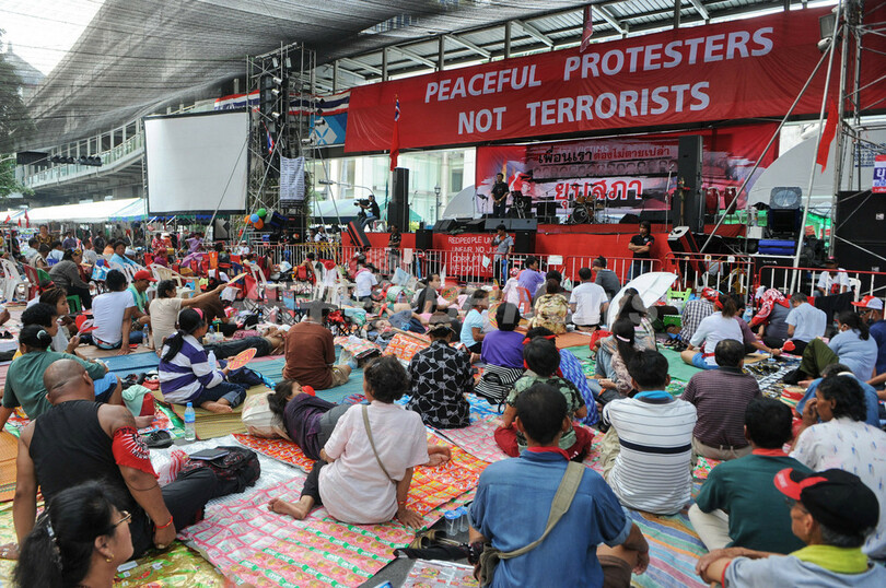 タクシン元首相派の抗議行動が続くバンコクでは、一時的に事態が沈静化したのもつかの間、市中心部にある集会拠点から移動した赤シャツ隊の一群を、治安部隊と警察の機動隊などが数百人で阻止すると、激しい衝突が発生した。