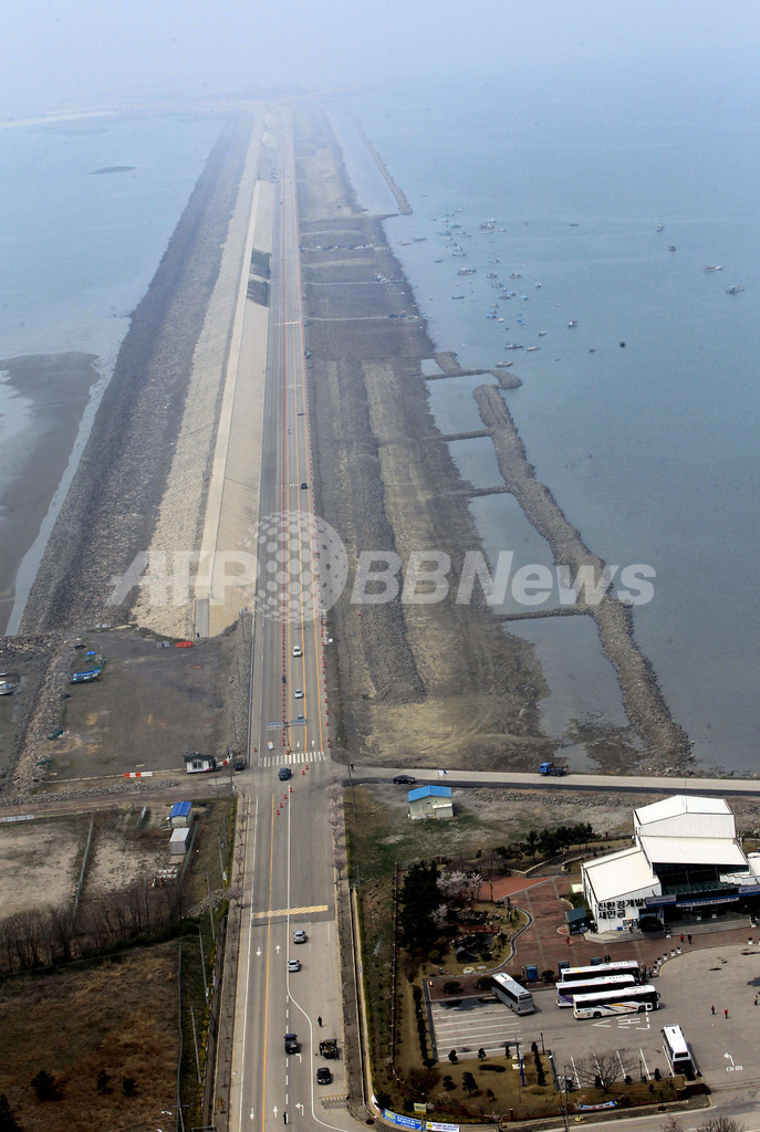 【4月28日 AFP】韓国西部の全羅北道(Jeollabuk-do)で進んでいる「セマングム(Saemangeum)干拓事業」の一部で、全長33.9キロ、世界最長の防潮堤が完成し、27日に完工式が行われた。