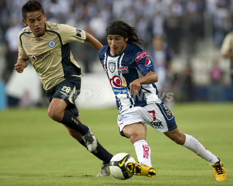 サッカーCONCACAFチャンピオンズリーグ(%%CONCACAF Champions League 2009-10%%)は28日、決勝の第2戦が行われ、CFパチューカ(%%CF Pachuca%%、メキシコ)がクルス・アスル(%%Cruz Azu%%、メキシコ)に1-0で勝利し、2試合合計スコアが2-2となったがアウェーゴール規定により優勝を果たした。パチューカは10クラブW杯(%%2010 FIFA Club World Cup%%)の出場権を獲得した。写真はクルス・アスルのエクトル・エンリケ・グティエレス(%%Hector Enrique Gutierrez%%)と競り合うパチューカのダミアン・アルバレス(%%Damian Ariel Alvarez%%、右)。(2010年4月28日撮影)(c)AFP/OMAR TORRES
