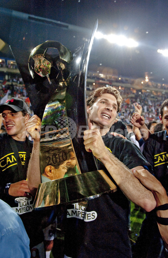 サッカーCONCACAFチャンピオンズリーグ(%%CONCACAF Champions League 2009-10%%)は28日、決勝の第2戦が行われ、CFパチューカ(%%CF Pachuca%%、メキシコ)がクルス・アスル(%%Cruz Azu%%、メキシコ)に1-0で勝利し、2試合合計スコアが2-2となったがアウェーゴール規定により優勝を果たした。パチューカは10クラブW杯(%%2010 FIFA Club World Cup%%)の出場権を獲得した。写真はトロフィーを手にするパチューカのハビエル・ムニョス・ムスタファ(%%Javier David Munoz Mustafa%%)。(2010年4月28日撮影)(c)AFP/OMAR TORRES