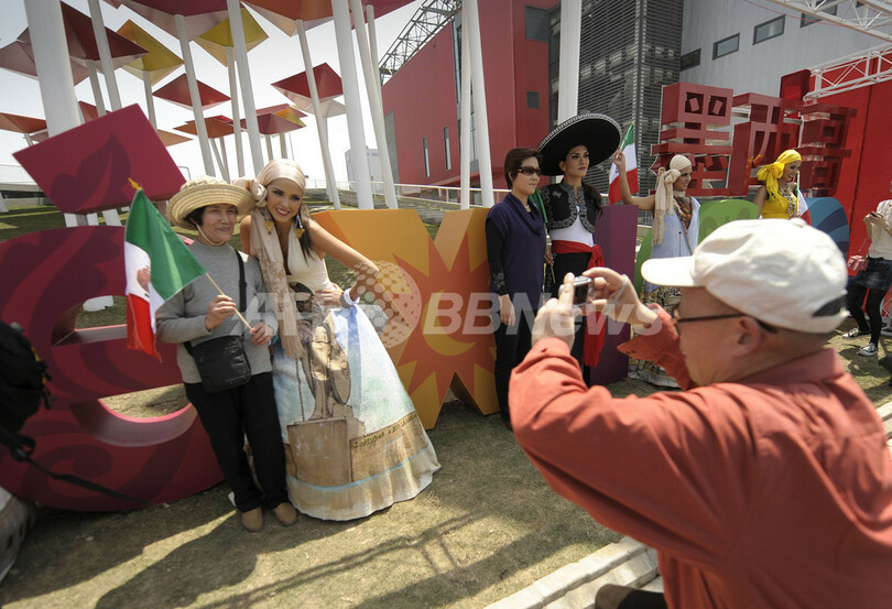 写真は、メキシコ館で記念撮影をする来場者たち(2010年5月1日撮影)。(c)AFP/eter PARKS